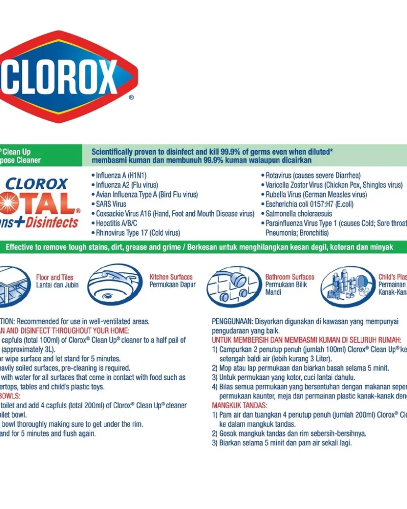 Multipurpose disinfectant cleaner for household surfaces.